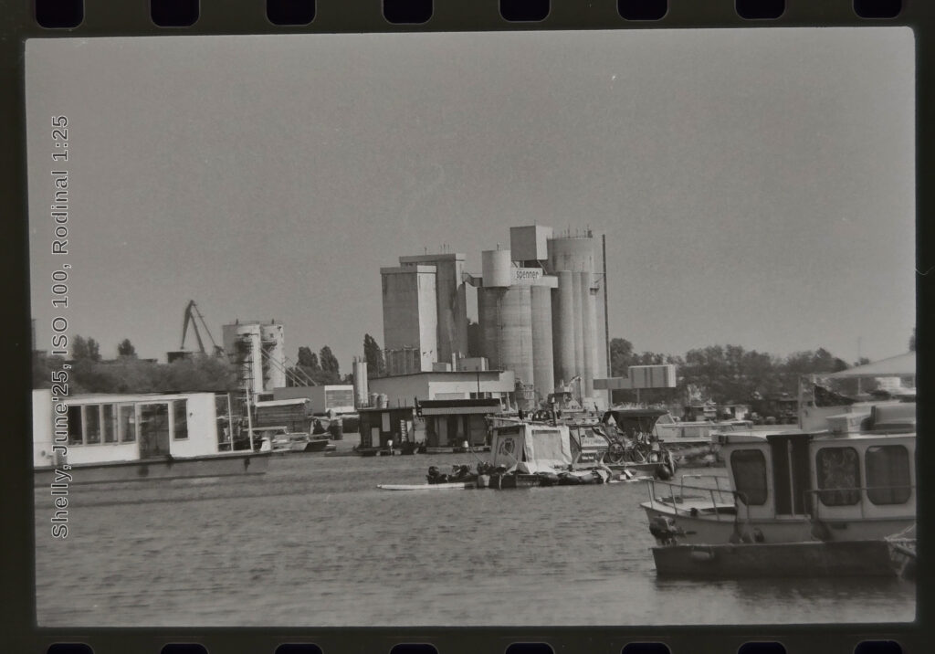 Rummelsburger Bucht and its junction with the Spree have long been shaped by a free-spirited houseboat culture. Their presence cuts across the orderly systems lining the banks in Berlin-Alt-Stralau, Rummelsburg, and Treptower Park, as well as the industrial complexes that grow denser farther east along the river. (Shelly, June’25, ISO 100, Rodinal 1:25, Digital-Pre-Scan)