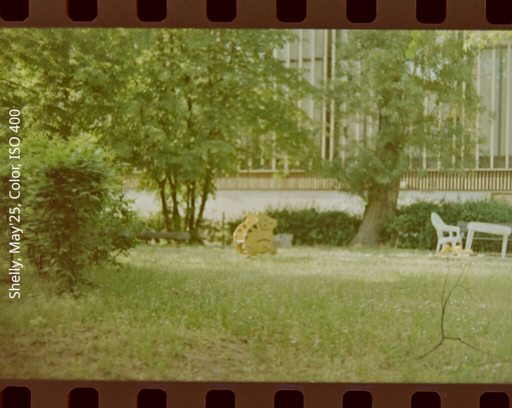 This photo was taken in a courtyard in Berlin-Lichtenberg. The playground’s layout and composition are so fragmented, so out of place. I find the setting oppressive—almost morbid. The image gives me a horror vibe. (Shelly, May’25, ISO 400, Color)