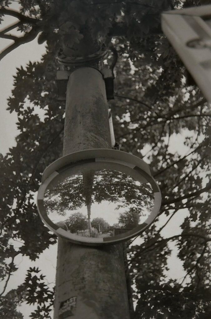 This image was taken in Berlin-Friedrichshain near the Modersohn Bridge. A steel pipe has run here for many years, spanning the driveway to an industrial site. The mirror was installed so that vehicles entering could see the premises. My focus, however, was on the interplay of trees and leaves with the pipe and the mirror. Over the years, trees and shrubs have wrapped themselves around the pipe. This interaction created the motif: the steel pipe itself becomes a tree trunk, and the leafy canopy forms a crown for it. The mirror, meanwhile, introduces an alternate reality. (Shelly, May’25, ISO 100, Rodinal 1:25, Digital-Pre-Scan)