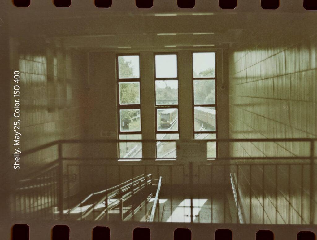 This photo was taken at Hellersdorf metro station. I like the colors—they capture a feeling of stillness. That sense of calm went hand-in-hand with my determination to frame the arriving metro train in the middle window. In general, I find the interplay of light, reflections, and shadows fascinating; they somehow breathe movement into an otherwise static place. (Shelly, May’25, ISO 400, Color, Digital-Pre-Scan)